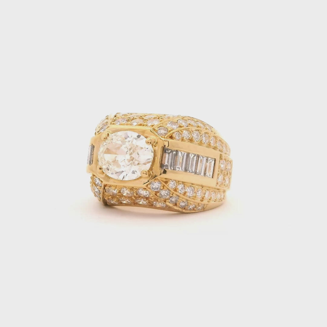 Anillo de Oro con Diamante Central, Diamantes Baguette y Pavé