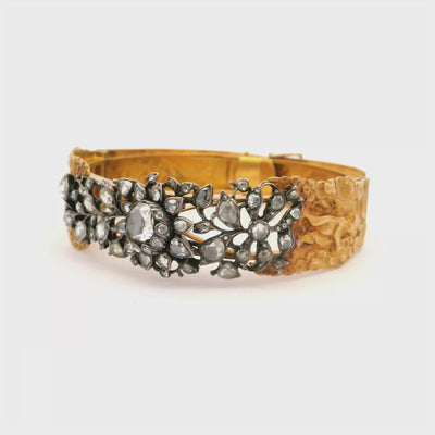 La estructura de la pulsera presenta laterales en oro finamente trabajados y grabados a mano, con un relieve orgánico que aporta textura, historia y un carácter artesanal imposible de replicar en piezas contemporáneas. El contraste entre el oro cálido y el montado oscuro de los diamantes —típico del estilo georgiano y victoriano— realza aún más el brillo suave y misterioso de la talla rosa.